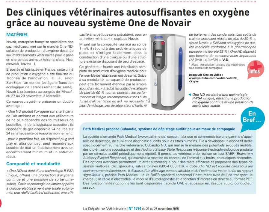 La Dépêche Vétérinaire consacre un article complet à ONE de NOVAIR, la nouvelle solution de production d’oxygène spécialement conçue pour les cliniques vétérinaires souhaitant renforcer leur autonomie et sécuriser leur approvisionnement.