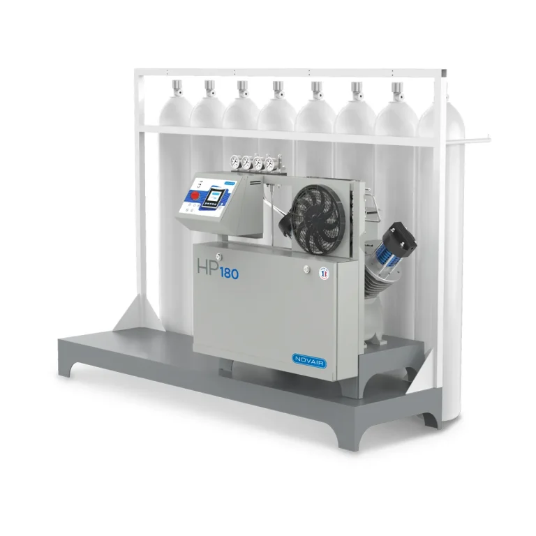 NOVAIR propose une gamme de systèmes de remplissage de bouteilles d’oxygène médical à haute pression, conçue pour fonctionner de façon autonome et fiable au sein de votre établissement. Alliant performance, robustesse et simplicité d’utilisation, la gamme HP garantit une alimentation fluide en oxygène, avec une autonomie complète sur site.