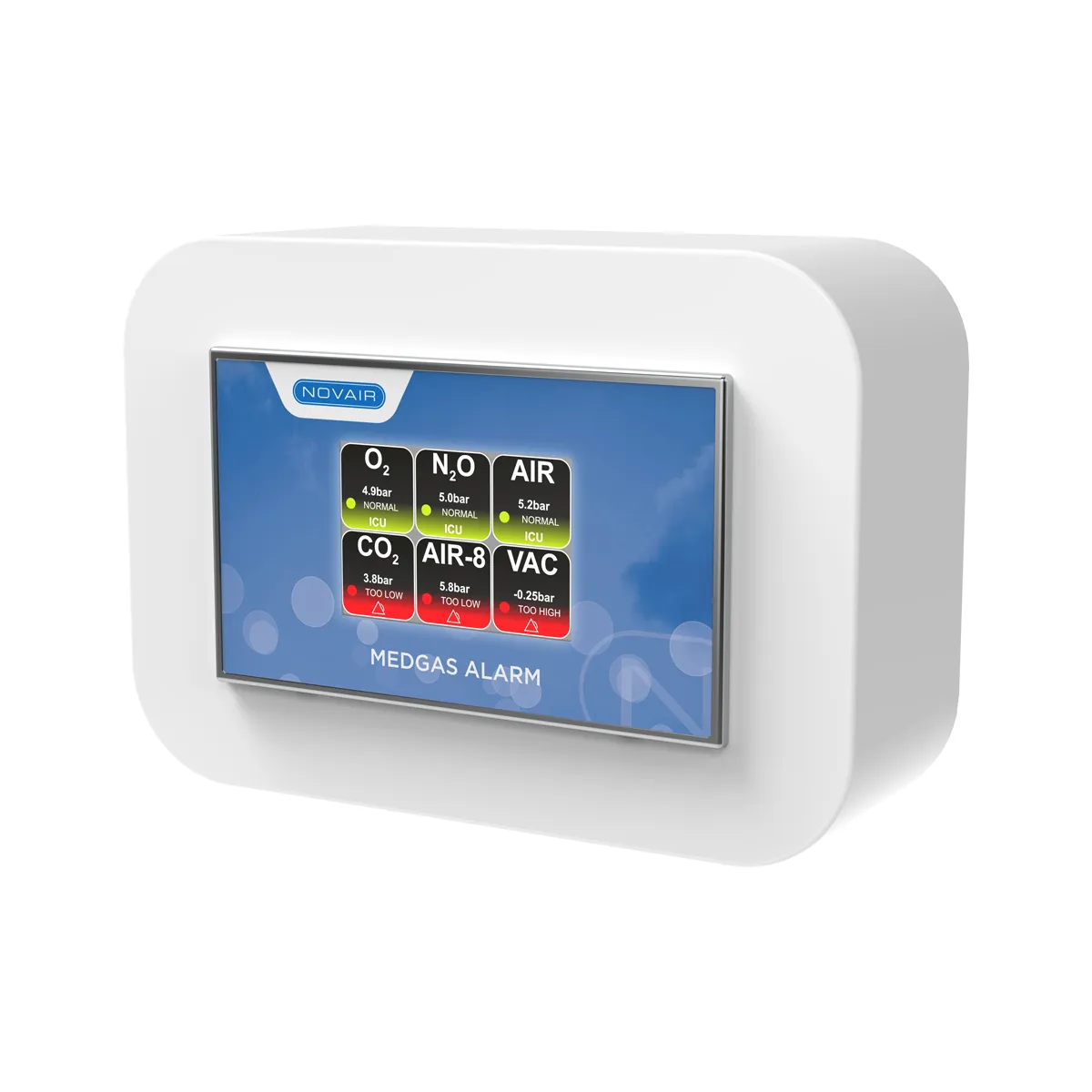 MEDGAS ALARM est conçu pour contrôler en continu la pression des réseaux de gaz médicaux et détecter toute variation anormale, garantissant ainsi la sécurité des installations et la protection des patients. Connecté au réseau, il peut surveiller l’oxygène, l’air médical et chirurgical, le protoxyde d’azote, le dioxyde de carbone et le vide.